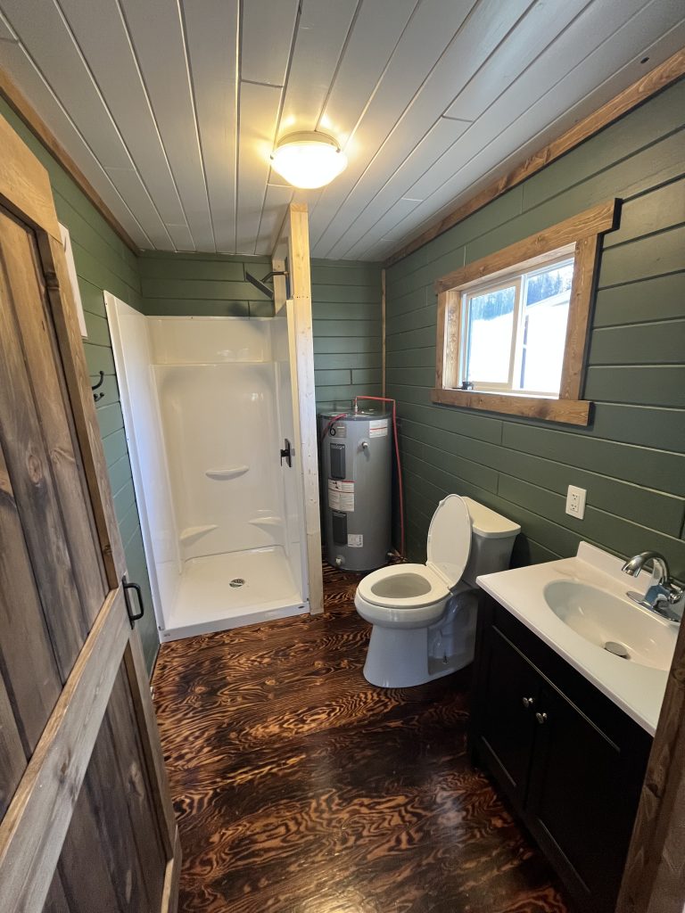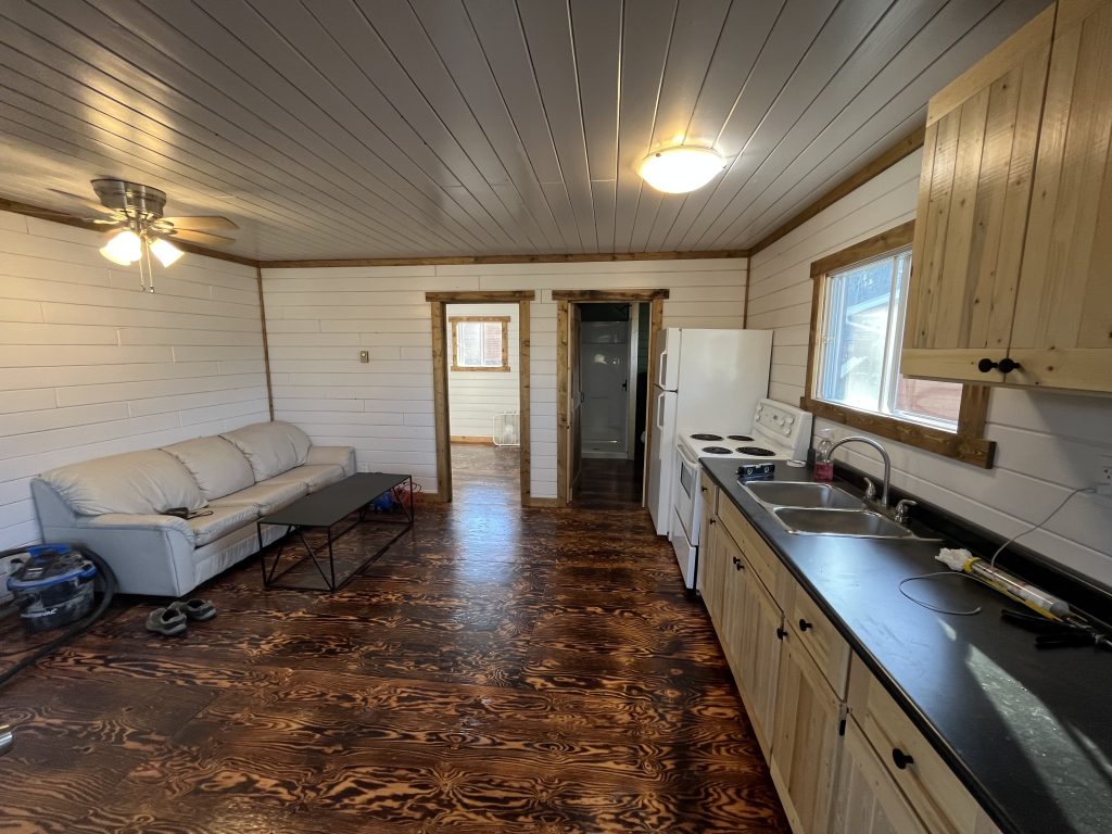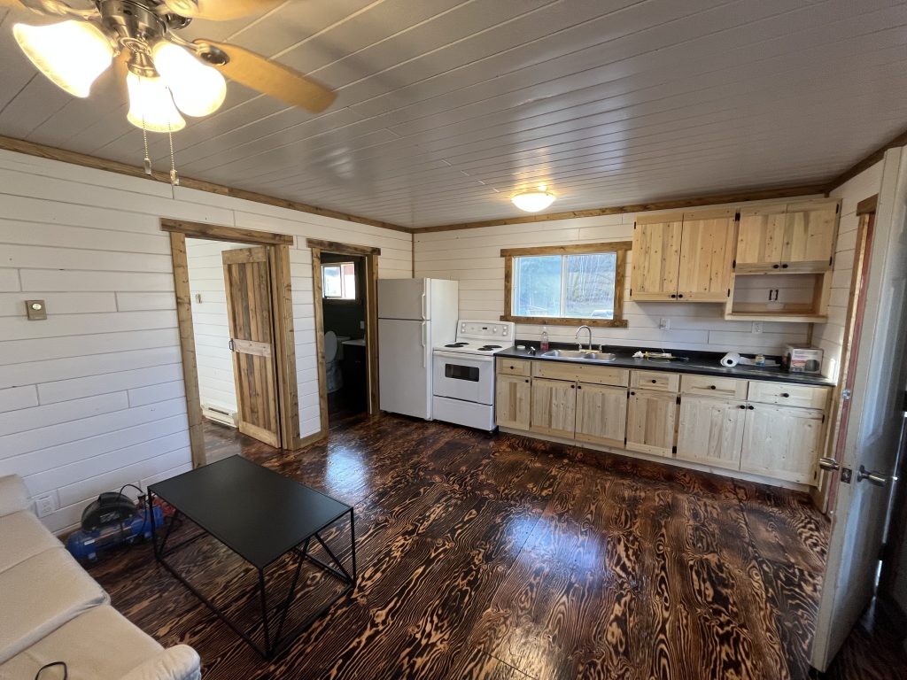 This one bedroom cabin is known to most as our “Honeymoon Suite”. It has a queen bed in it and a brand new custom built kitchen and 36″ shower so that you can reach your toes! It has bright, white pine on all its walls and a screened in porch that faces the lake. It is just a short 20 meter walk down to the dock.